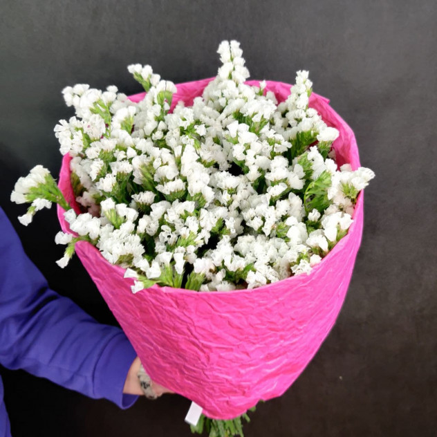 Хотите удивить? Букет создан специально для вашего желания! Дарите цветы, и пусть они будут не обычны! Состав Кермек (Статица, Лимониум) - 15 шт. Лента - 1 шт. Пленка - 1 шт.