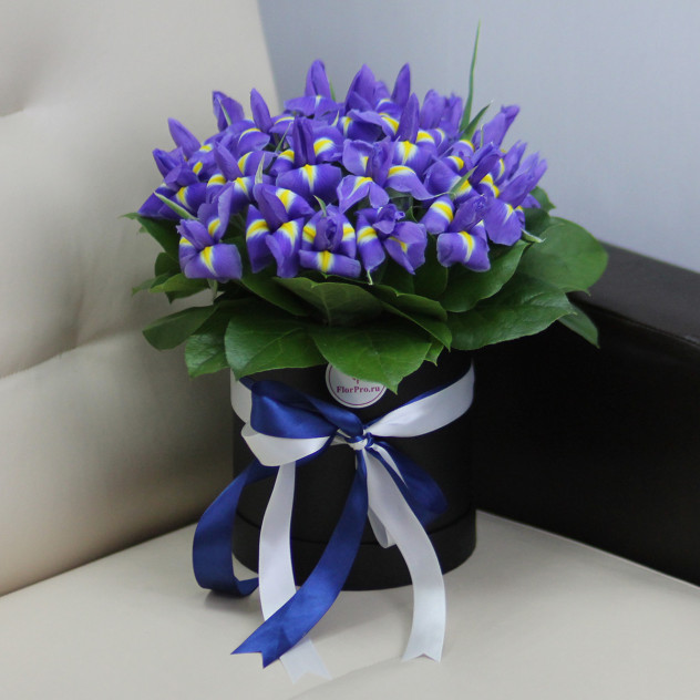 Синие ирисы в шляпной коробке.