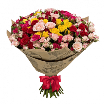 Очень милый букет из хризантем, кустовых роз и эустомы. Прекрасно подойдет на любое торжество.