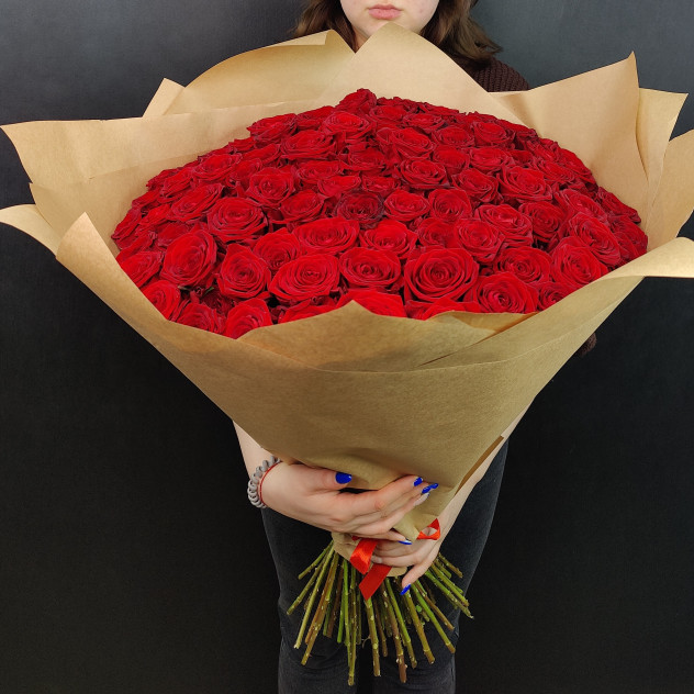 Алые цветы в шикарном букете из 101 розы – такой подарок бросают к ногам самых любимых дам сердца. Бархатные бутоны на длинных стеблях украсят любой праздник.