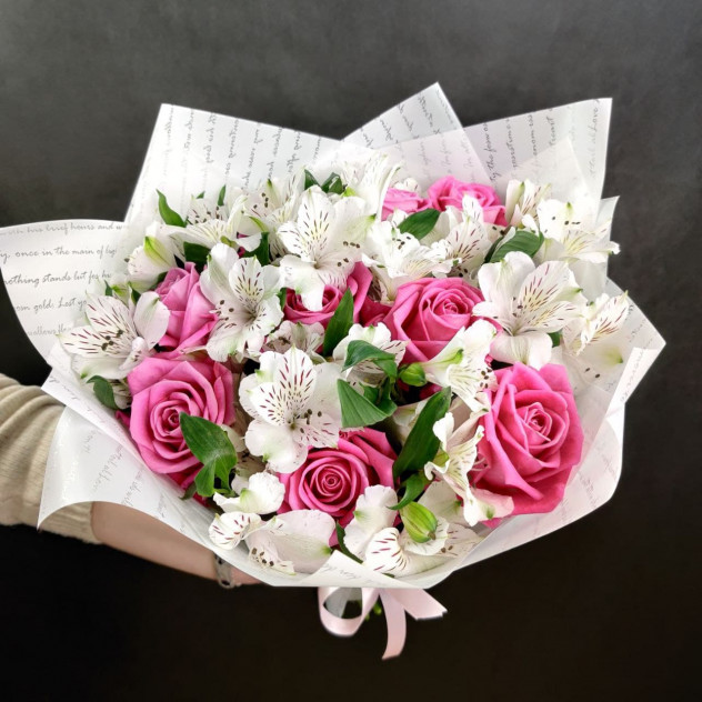 Нежный букет из альстромерии и роз,в дизайнерской пленке,подарят незабываемое впечатление прекрасным представительницам женского пола!