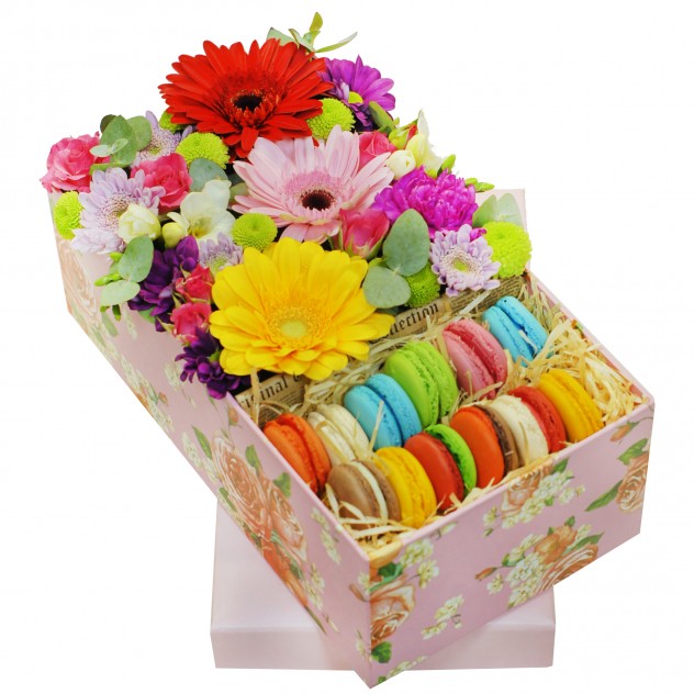 Состав: Подарочная коробка, оазис, макарони 12шт., декор, сезонные цветы на вкус флориста в желаемой цветовой гамме
