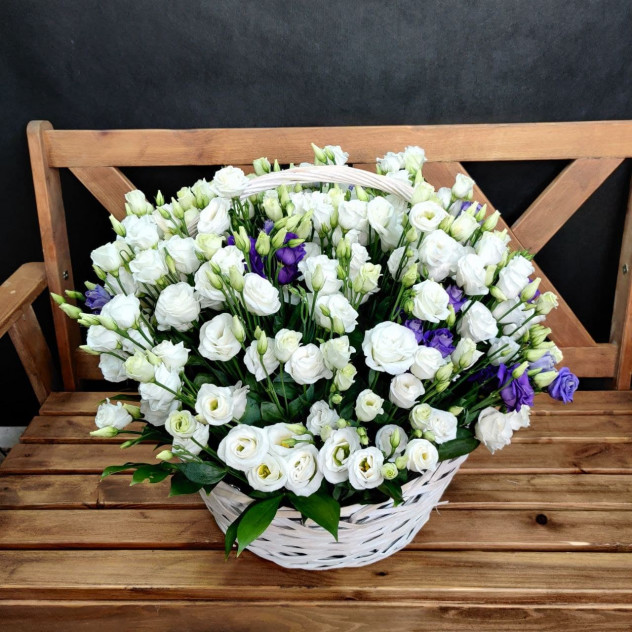 Шикарная, многогранная, огромная корзина из лизиантуса. Это мега корзина сделана для того ,что бы удивиться самому и удивить близких! Она достойна быть подаренной по любому поводу.
