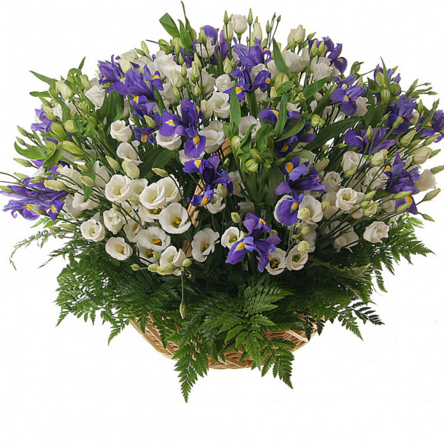 Состав: Упаковка (пленка с лентой), Лизиантус 20шт., Ирис 30шт., Альстромерия 10шт., Папоротник 20шт., Рускус 50шт., Корзина плетеная, Пиафлор (оазис) 4шт.
